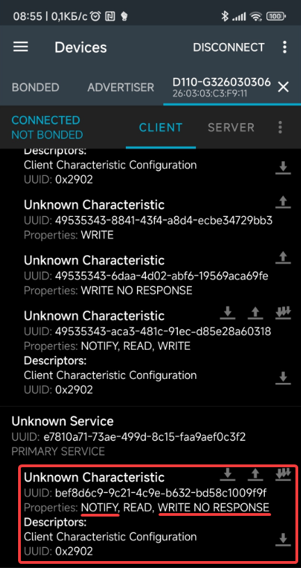 Anyway, most of NIIMBOT printers have characteristic bef8d6c9-9c21-4c9e-b632-bd58c1009f9f of service e7810a71-73ae-499d-8c15-faa9aef0c3f2.